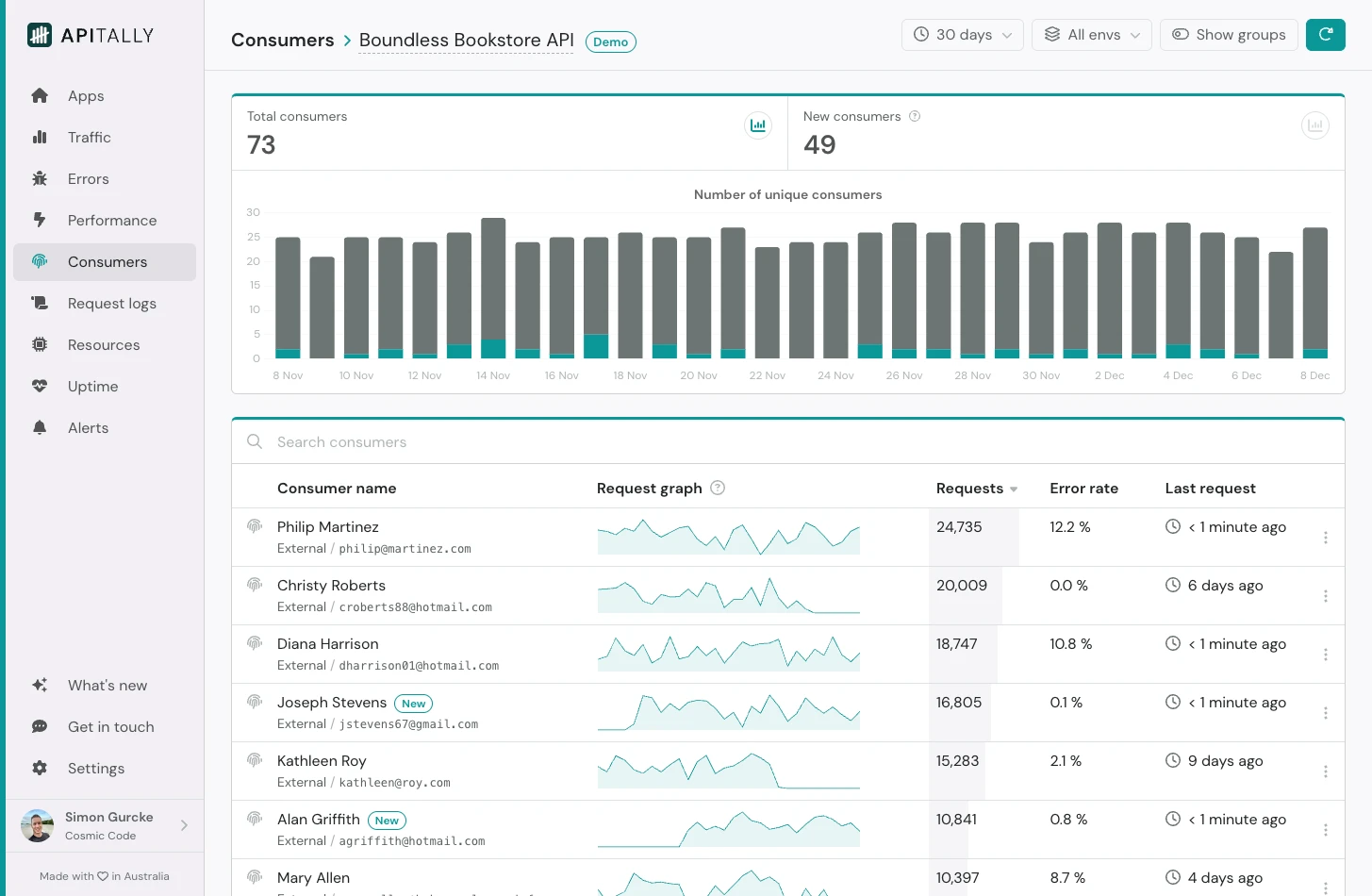 Apitally allows you to track API adoption and helps you understand how individual consumers use your API.